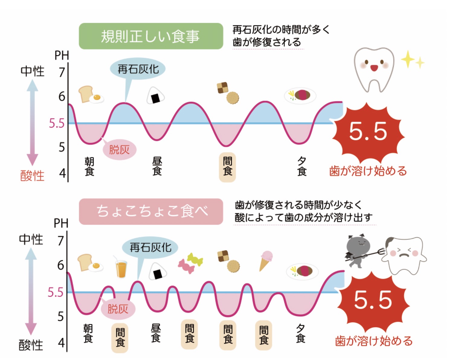 おやつを食べるとむし歯になるっていうイメージがあると思いますが規則正しくとれば特に問題は