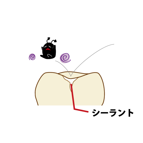 シーラントとは、汚れが溜まりやすい奥歯の噛む面の溝や側面の溝を、フッ素が配合された樹脂で埋めて虫歯を予防する処置のことを言います。